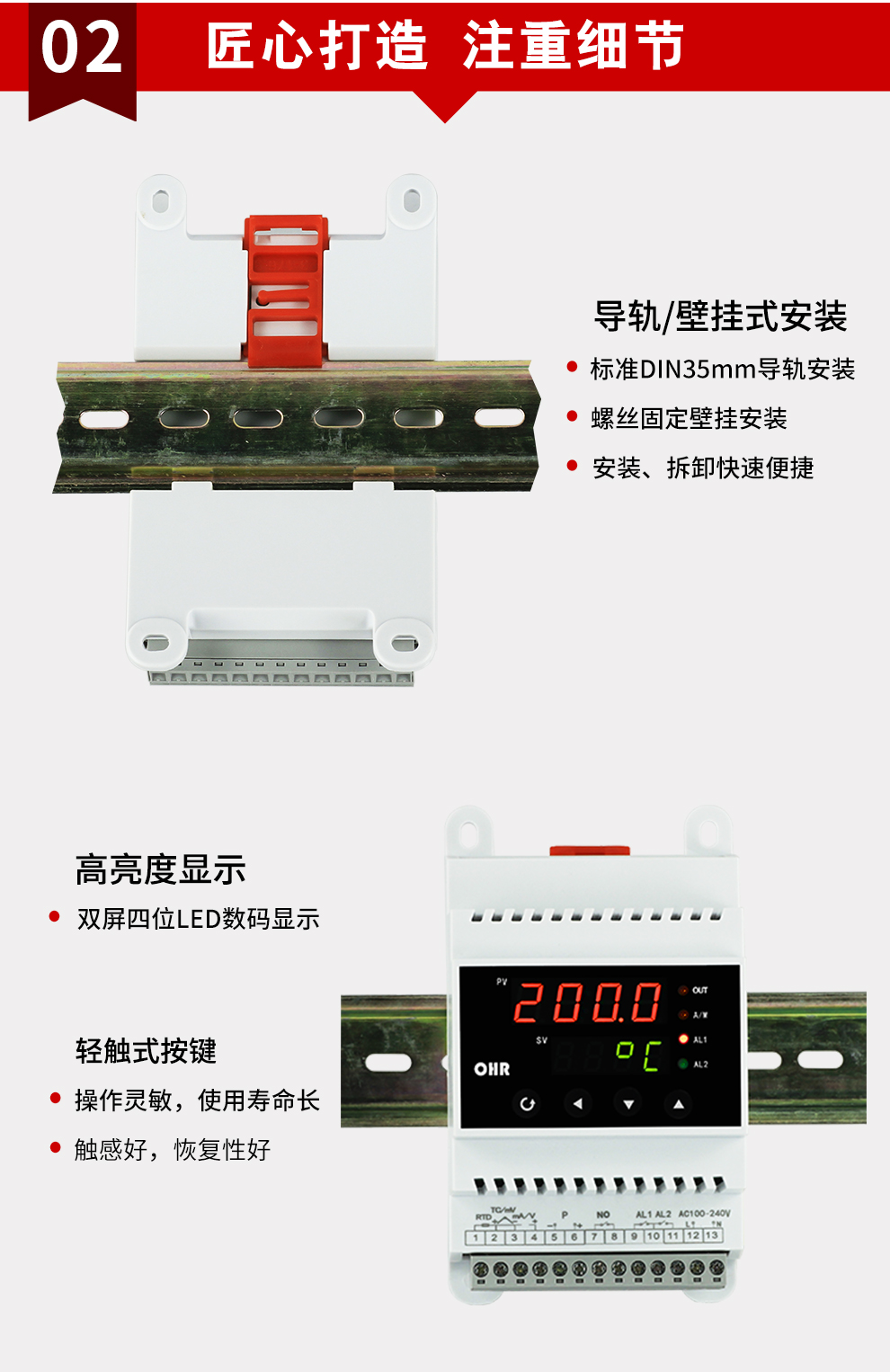 導軌式數(shù)字顯示控制儀采用了表面貼裝工藝,全自動貼片機生產(chǎn),具有很強的抗干擾能力??蓪囟取毫?、液位等工業(yè)過程參數(shù)進行測量、顯示、報警控制、變送輸出、數(shù)據(jù)采集及通訊。