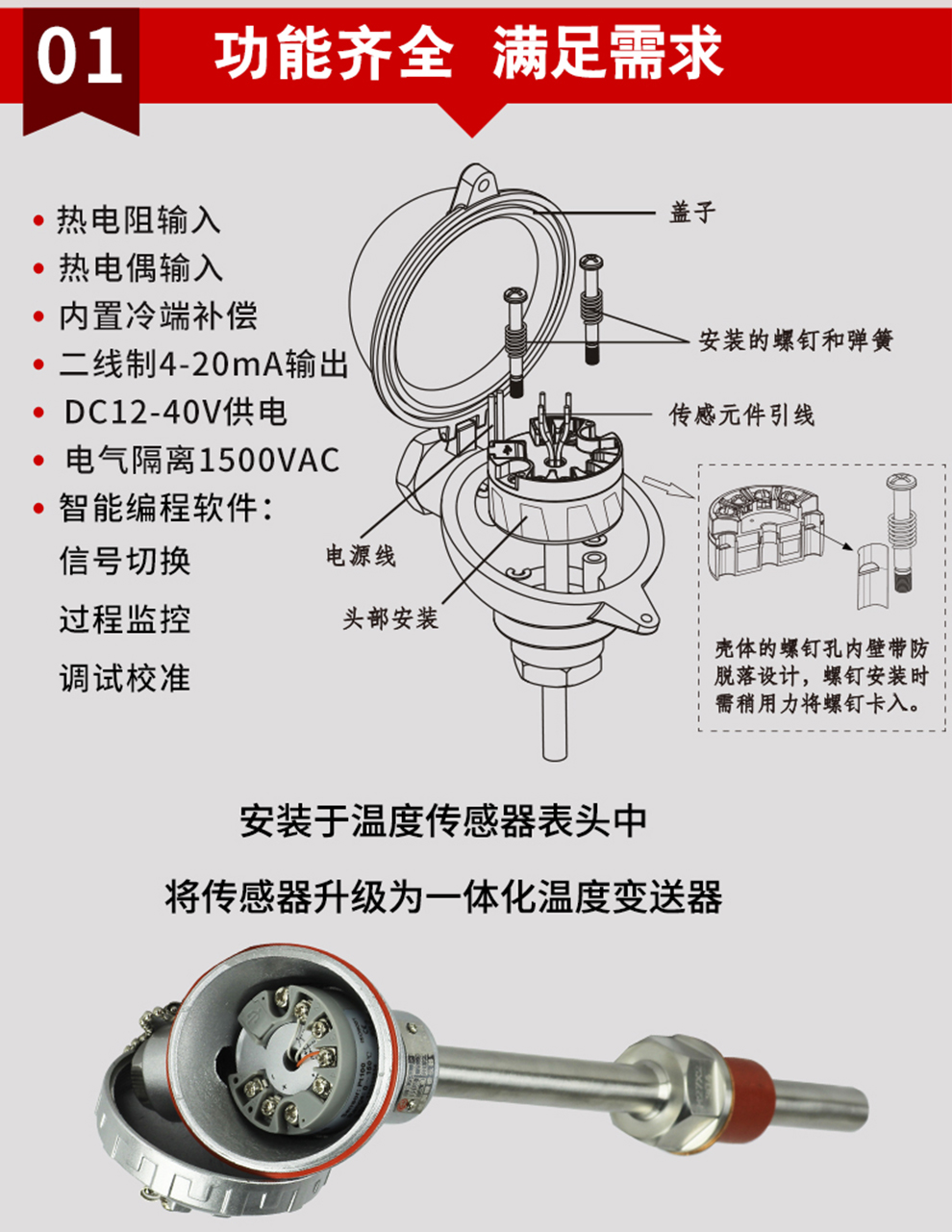 溫度變送器將現(xiàn)場(chǎng)的熱電阻或熱電偶等溫度傳感器信號(hào)經(jīng)過(guò)隔離放大處理,轉(zhuǎn)換為與溫度成線(xiàn)性的二線(xiàn)制4-20mA信號(hào)輸出至控制系統(tǒng)。