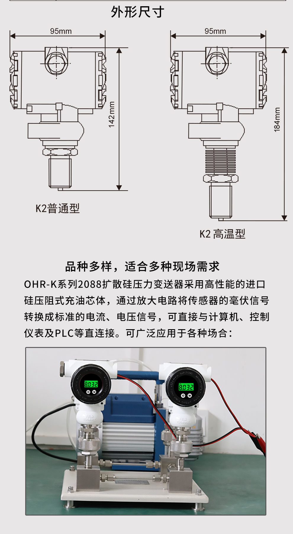 • K系列壓力變送器采用具有國(guó)際先進(jìn)水平的擴(kuò)散硅傳感器,配合高精度電子元件,經(jīng)嚴(yán)格的工藝過(guò)程裝配而成。充分發(fā)揮了傳感器的技術(shù)優(yōu)勢(shì),使該系列壓力變送器具有優(yōu)異的技術(shù)性能。該變送器抗過(guò)載和抗沖擊能力強(qiáng)、溫度漂移小、穩(wěn)定性高,具有很高的測(cè)量精度。