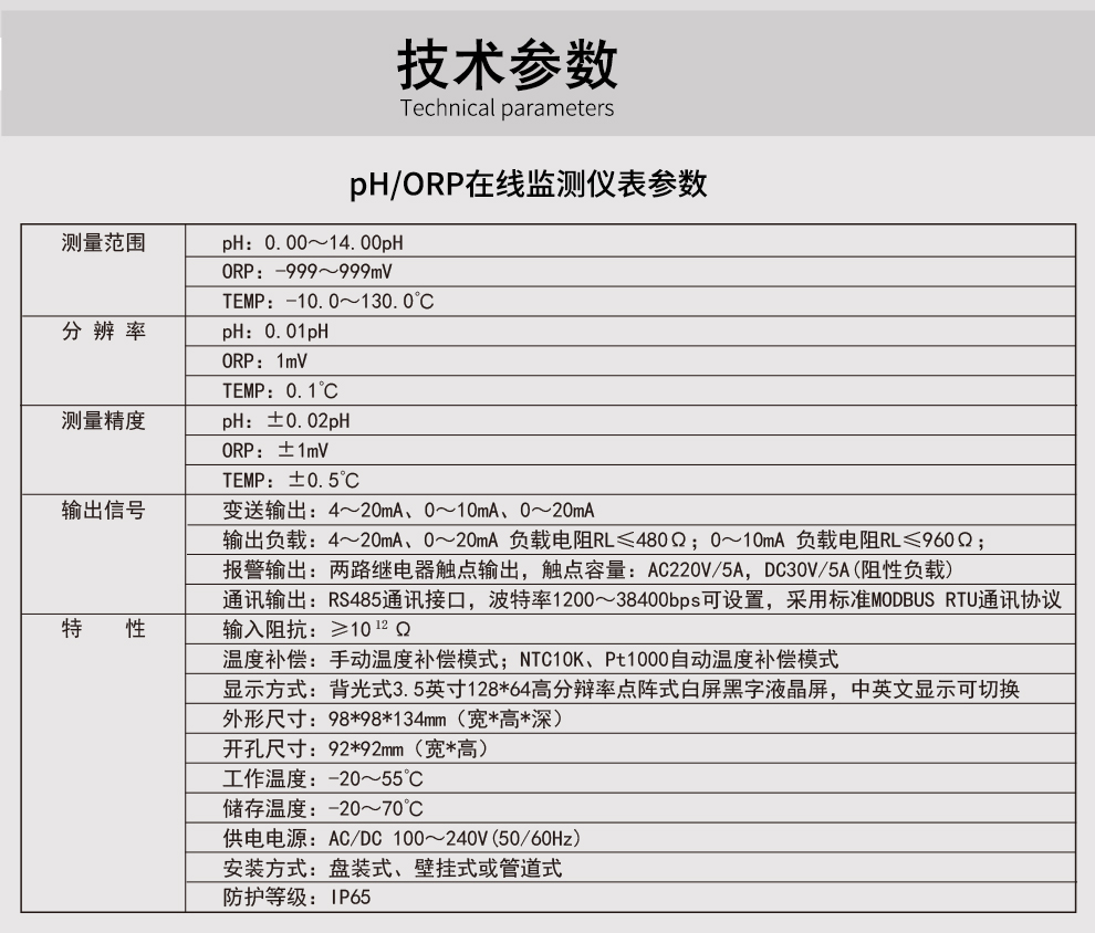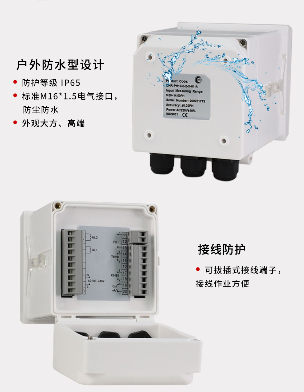 PH計采用高阻設計,測量穩(wěn)定不跳字,抗干擾能力強,戶外防水型結構,變送輸出精準
