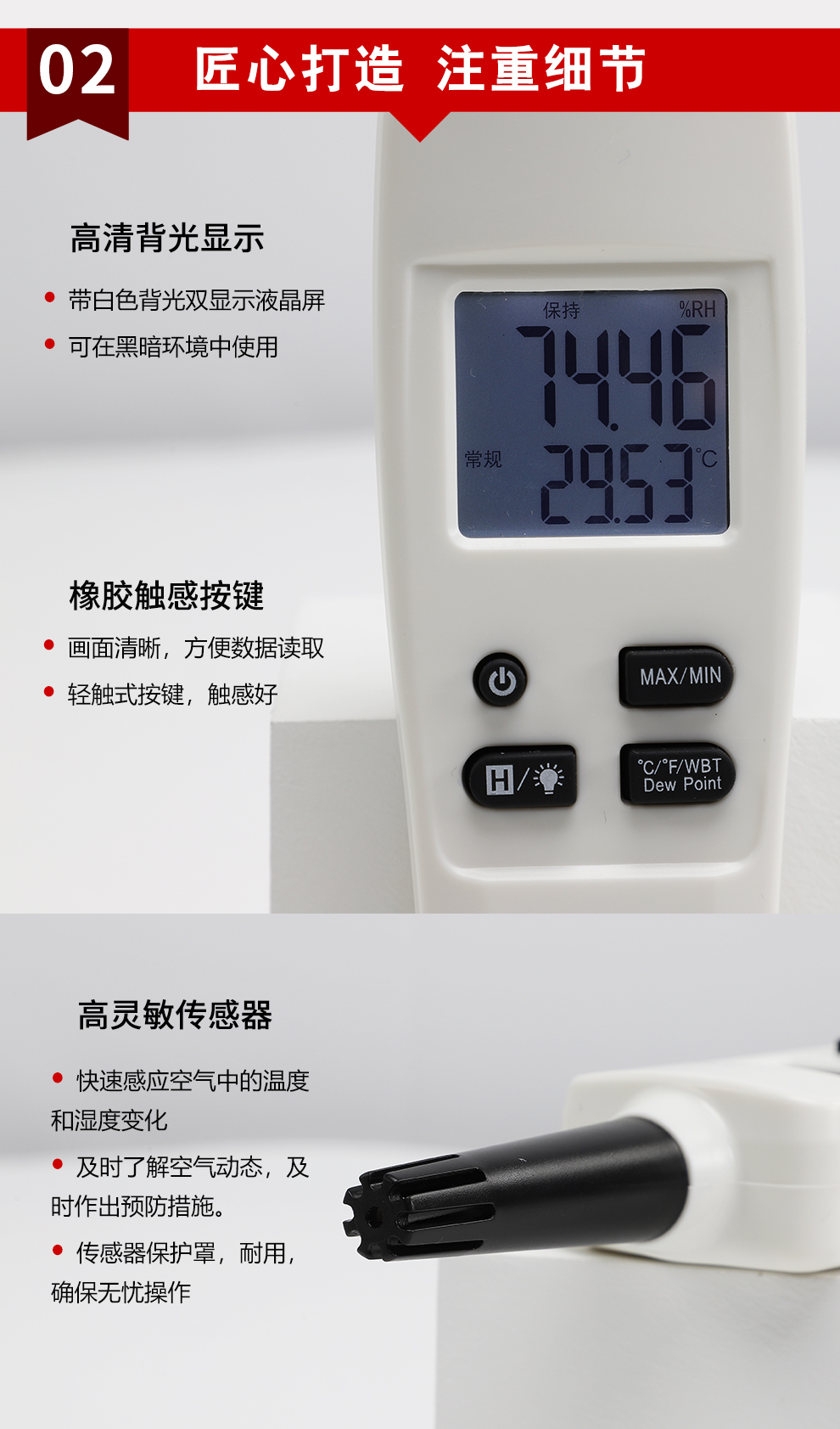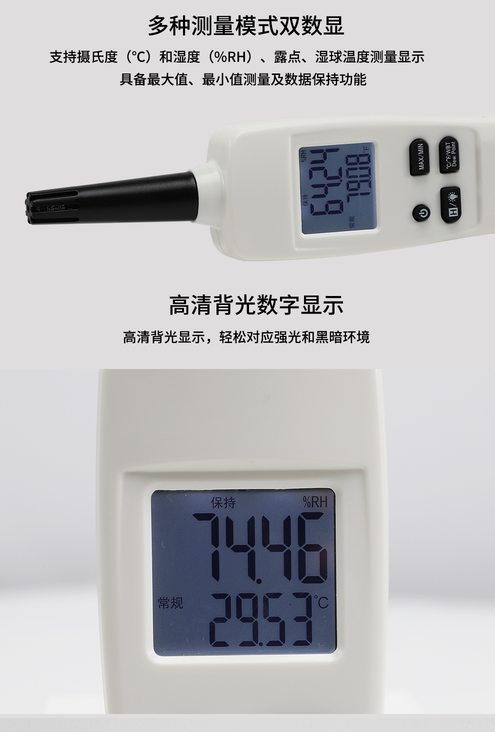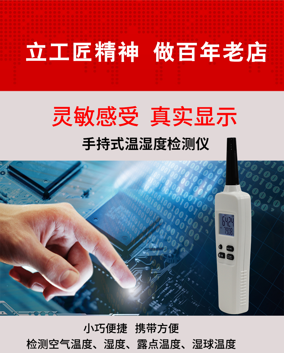 小巧便捷,攜帶方便,檢測(cè)空氣溫度、濕度、露點(diǎn)溫度、濕球溫度。